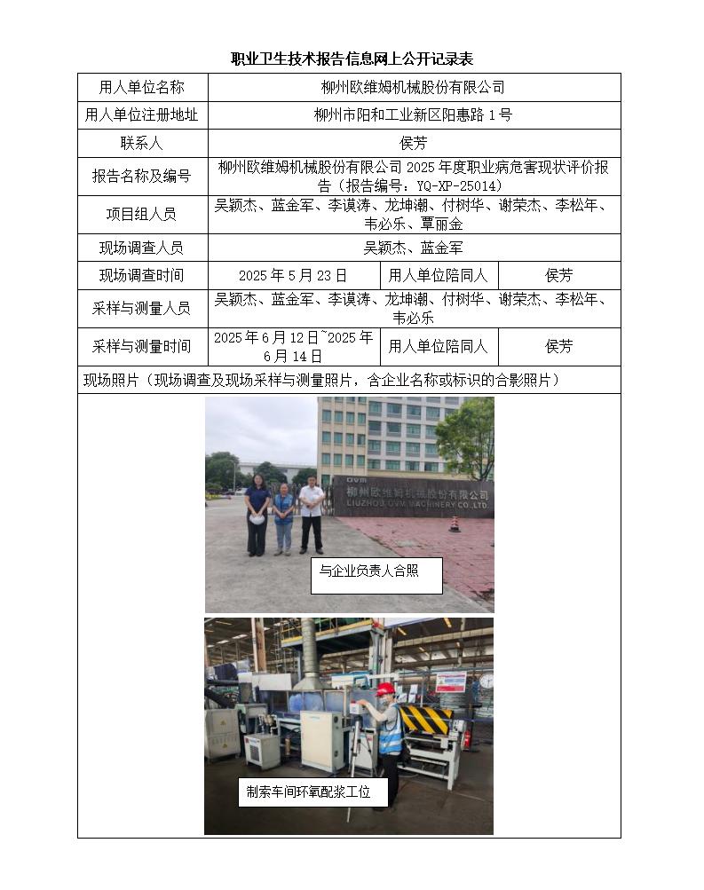 《柳州歐維姆機械股份有限公司2025年度職業病危害現狀評價報告》